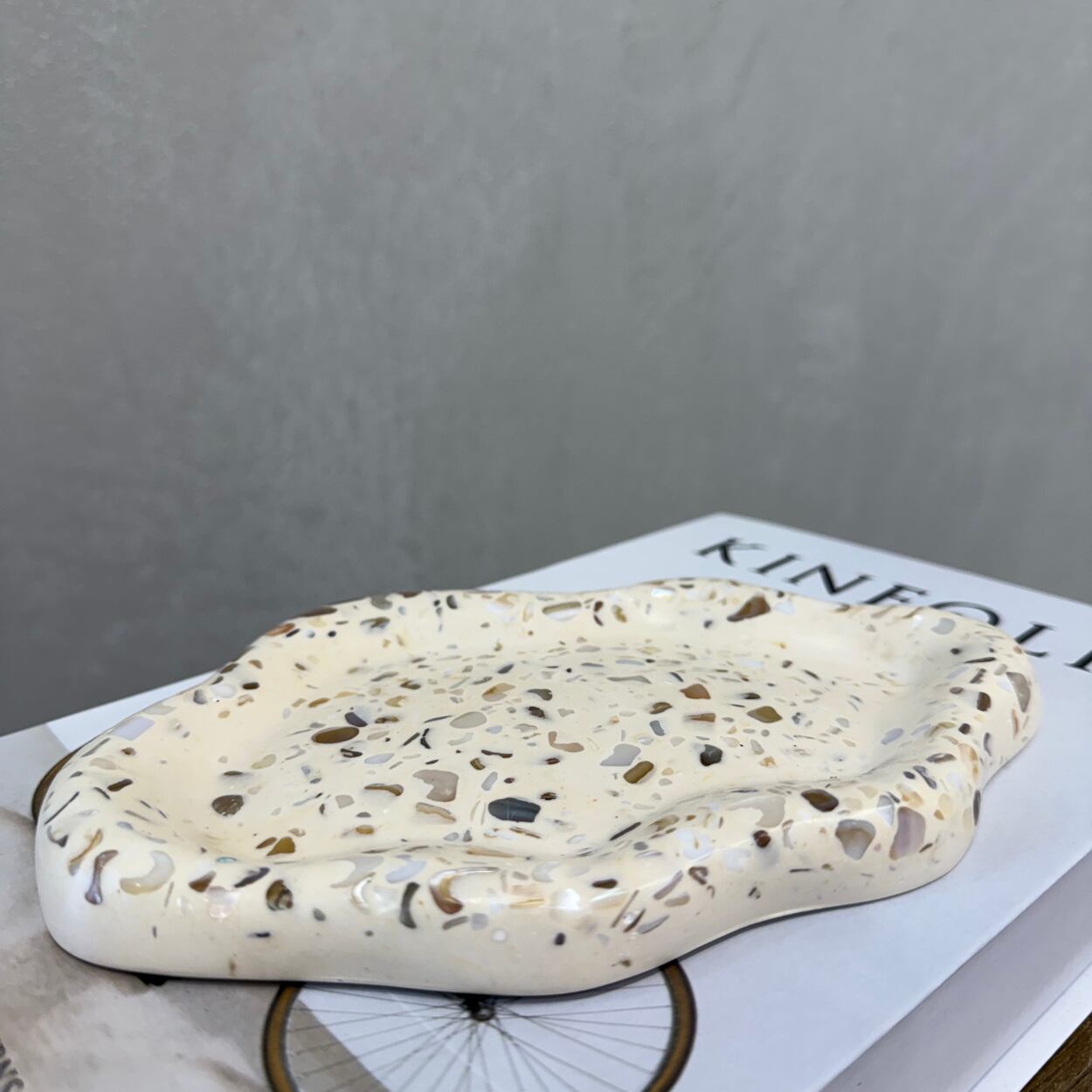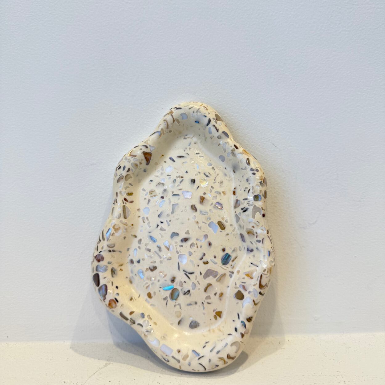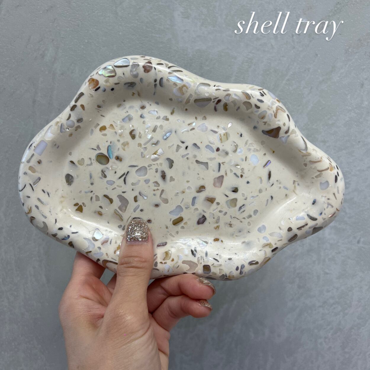 貝殻をあしらった、波のようなフォルムが美しいハンドメイドのシェルトレイ。